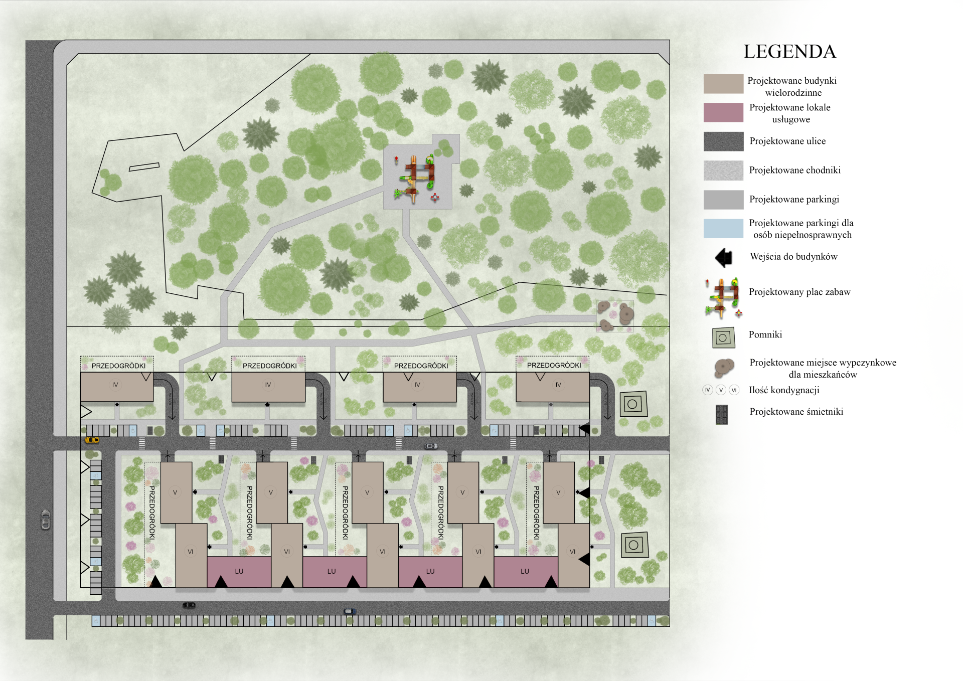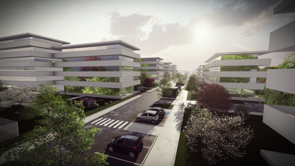 W celu ułatwienia dojazdu mieszkańcom do podziemnych garaży w blokach, projekt zakłada wprowadzenie uspokojonego ruchu kołowego na osiedle. Ponadto przewidziano przestrzenie zielone między blokami oraz przestrzeń do odpoczynku dla mieszkańców osiedla w lesie, gdzie znajduje się także plac zabaw dla dzieci.