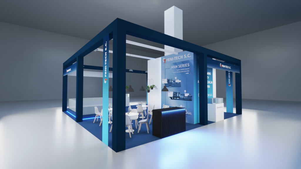 Realistyczna wizualizacja koncepcji stoiska targowego dla firmy FENI-TECH S.C. Projekt charakteryzuje się nowoczesnym, otwartym układem z wyrazistą konstrukcją w kolorze granatowym oraz podświetlanymi akcentami. Strefa spotkań została zaprojektowana z myślą o komforcie gości, a główna przestrzeń ekspozycyjna podkreśla kluczowe produkty firmy.