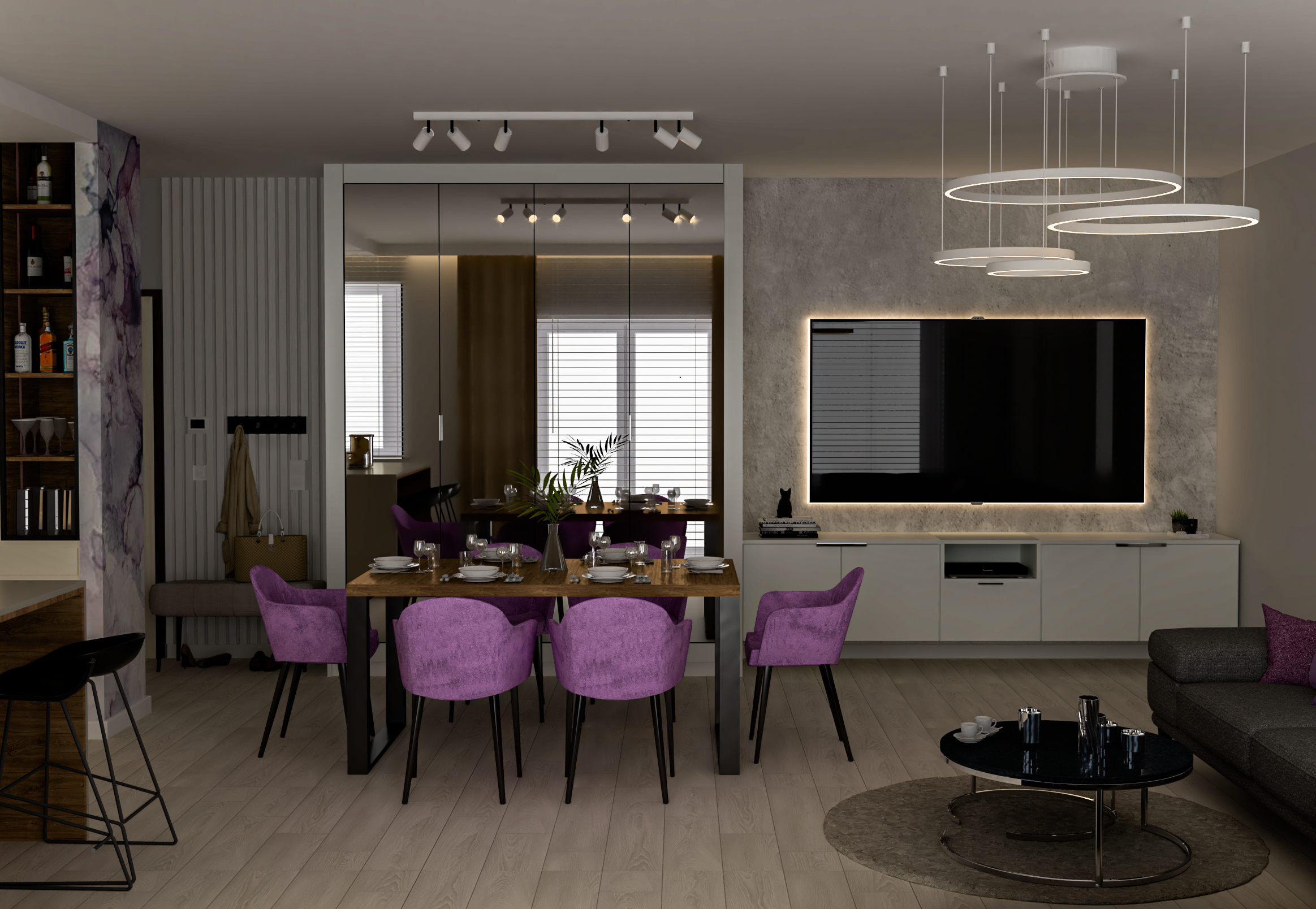 Moim zadaniem było stworzenie wysokiej jakości wizualizacji wnętrza, zgodnie z przygotowanym projektem. Skupiłam się na oddaniu zarówno estetyki, jak i funkcjonalności przestrzeni, dbając o atmosferę ciepła i przytulności. Szczególną uwagę poświęciłam detalom – odpowiedniemu oświetleniu, fakturom materiałów oraz kompozycji przestrzeni, aby wizualizacje wiernie oddawały zamysł projektowy.